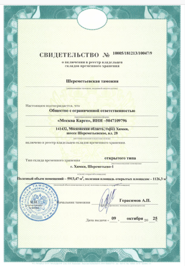 Свидетельство о включении в реестр владельцев складов временного хранения 10005 / 181213 / 10047 / 9 от 09.10.2025 г. (местонахождение помещения склада временного хранения: г. Химки, Шереметьево-1). Полезный объем помещений: 5 913,47 куб. м. Полезная площадь открытых площадок: 1126,3 кв. м.