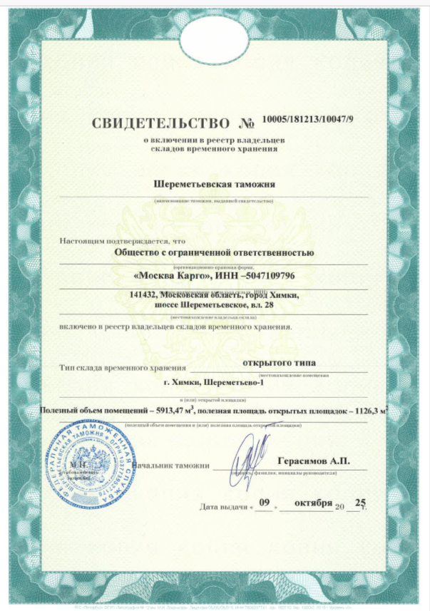 Информируем вас об изменении на ГРУЗОВОМ ТЕРМИНАЛЕ (ГТ2) номера Свидетельства о включении в реестр владельцев складов временного хранения (СВХ): Свидетельство № 10005 / 181213 / 10047 / 9 от 09.10.2025 г.